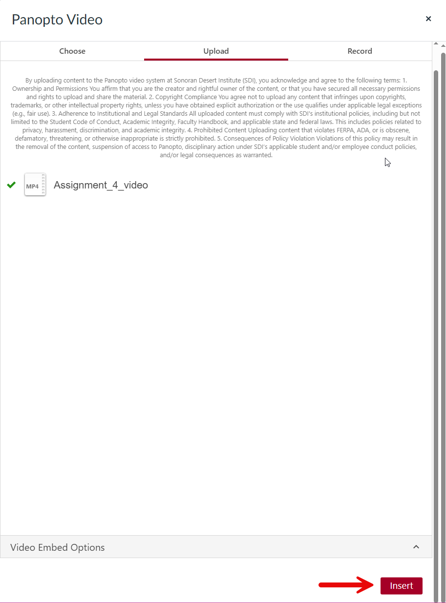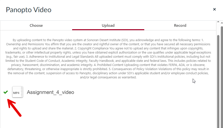 SDI uses Panopto Video in your course to manage video uploads and submission to assignments. Your instructor isn't able to see your video library, you will need to submit the video from Panopto to the assignment.