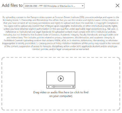 The first step to successfully upload a video to Panopto is making sure you have the video on your laptop or desktop computer. If you recorded the video on a smartphone or separate camera, it is best to transfer the video to your computer and save to a location you’ll remember (ex: your desktop or a specific folder with your video recordings)